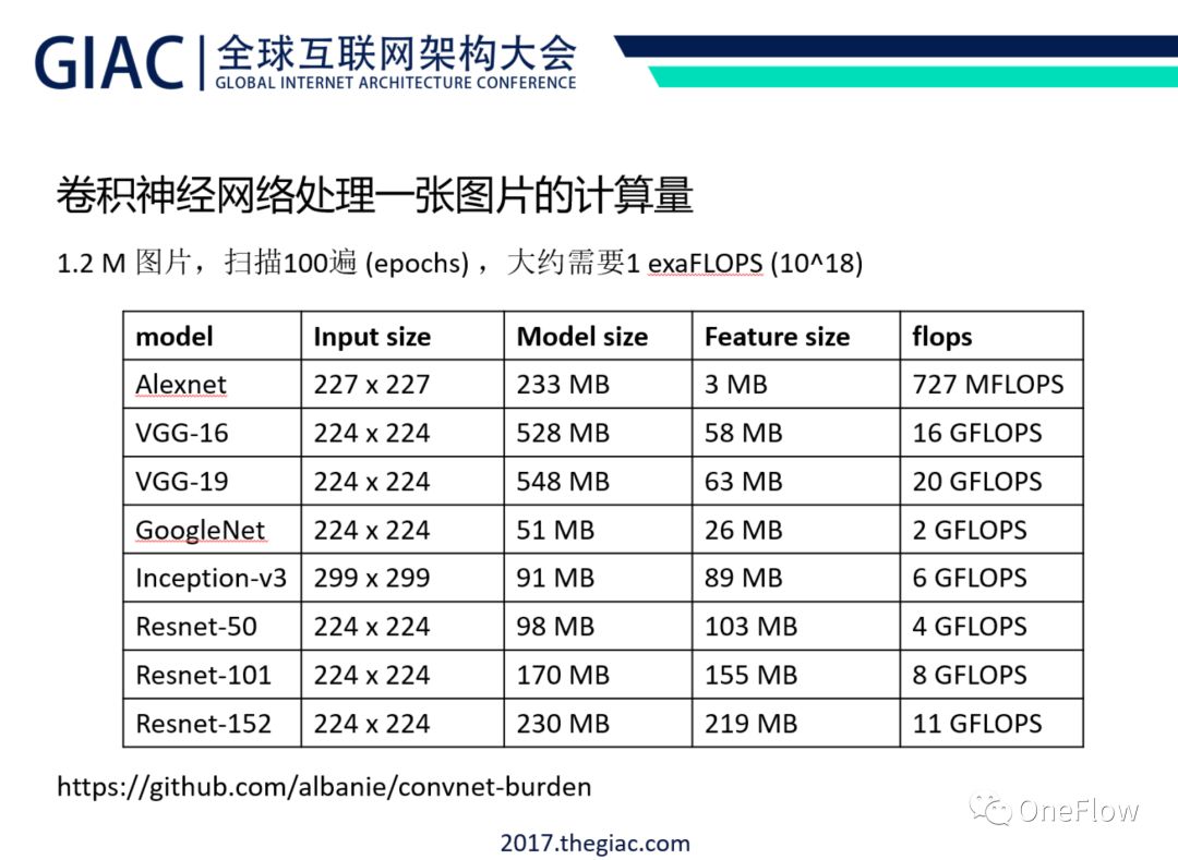 注:以大家耳熟能详的卷积神经网络CNN 为例,可以感觉一下目前训练深度学习模型需要多少计算力。这张表列出了常见CNN模型处理一张图片需要的内存容量和浮点计算次数,譬如VGG-16网络处理一张图片就需要16Gflops。值得注意的是,基于ImageNet数据集训练CNN,数据集一共大约120万张图片,训练算法需要对这个数据集扫描100遍(epoch),这意味着10^18次浮点计算,即1exaFlops。简单演算一下可发现,基于一个主频为2.0GHz的CPU core来训练这样的模型需要好几年的时间。下面我们看一下使用几种典型硬件来训练CNN模型需要多少时间。