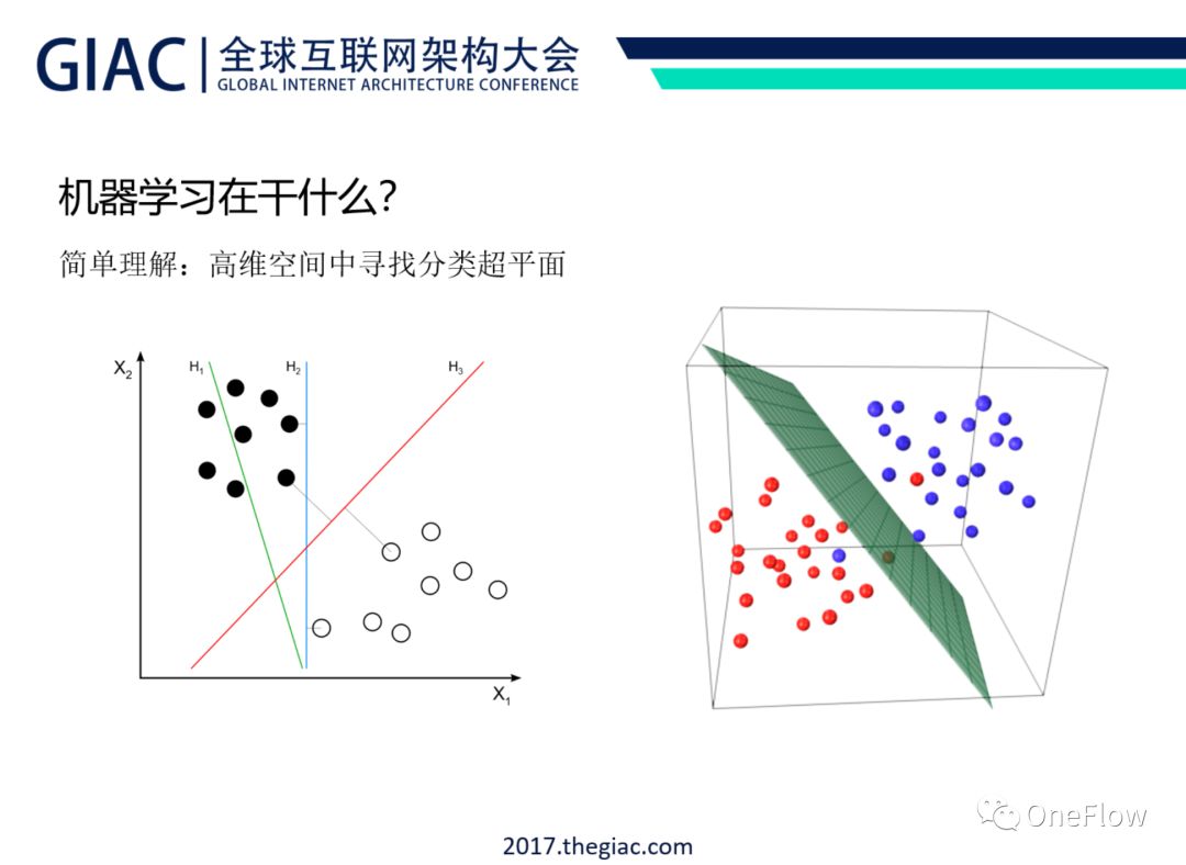 注:机器学习可以视为一种从训练数据中自动推导出程序的方法。以最常见的有监督学习(supervised learning)为例,可简单理解为,通过优化方法自动在高维空间找到分类超平面。