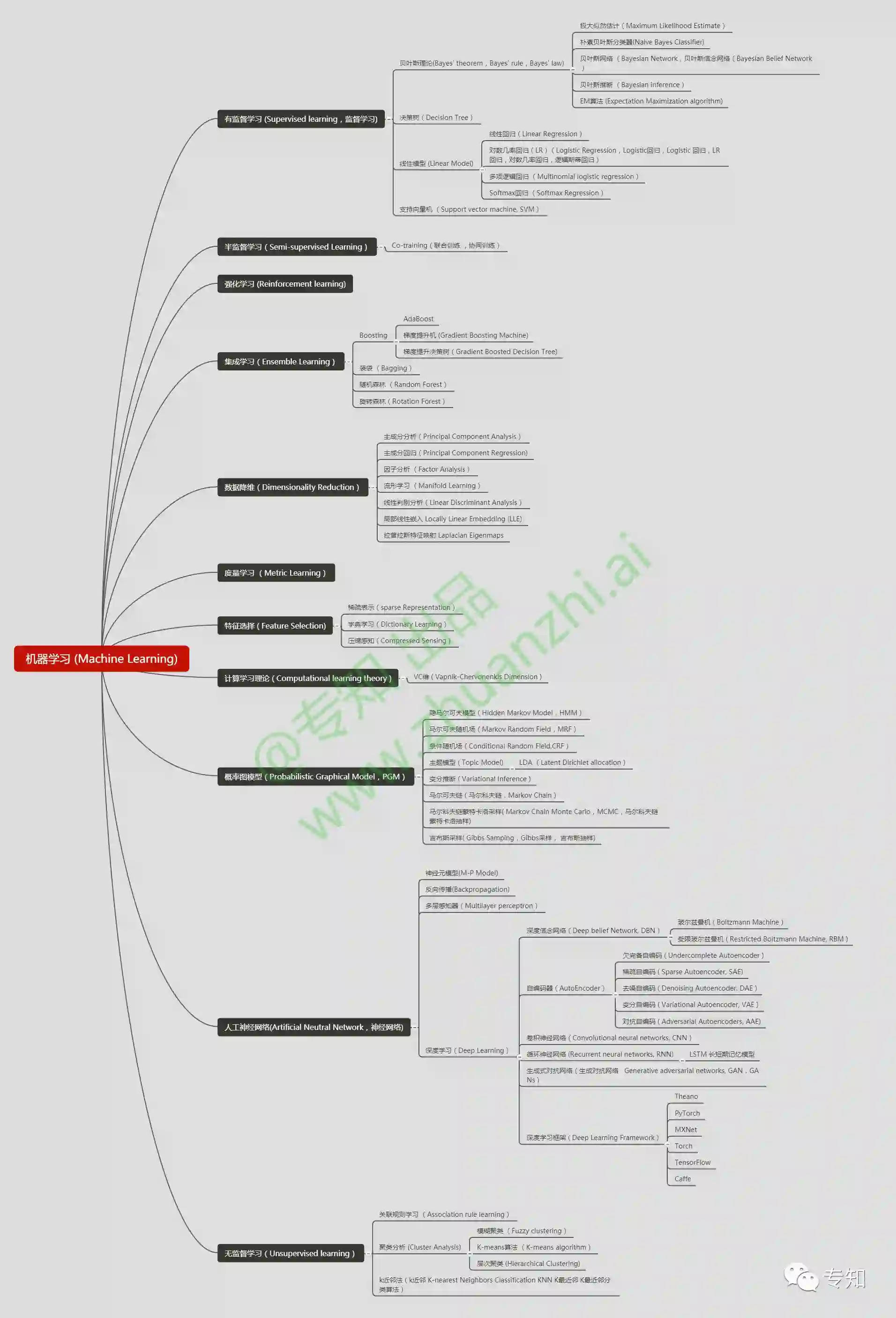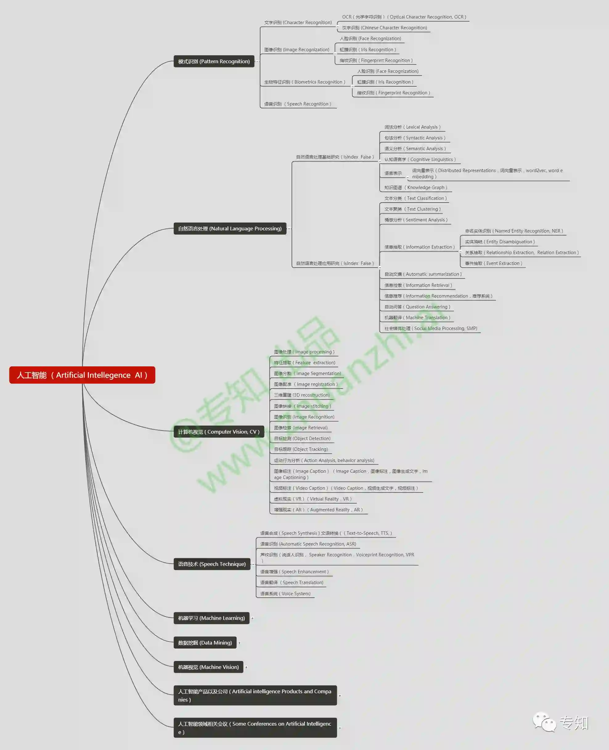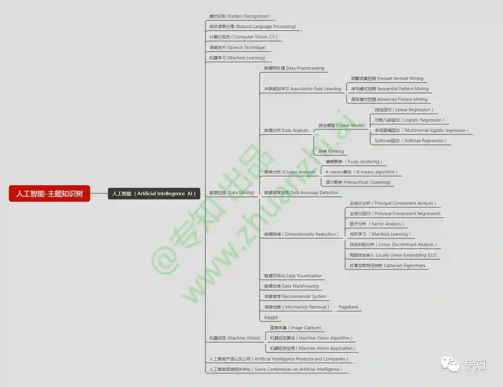 机器学昨天,我们介绍了专知的核心结构-《主题知识树》。 我们基于网络采集聚合抽取、众包机制贡献、先验知识融合的三种知识来源方式进行融合并专家审核构建完成人工智能主题知识树。主体以以人工智能、大数据、编程语言、系统架构四大类目来建设。今天我们展示人工智能的主题知识树可视化。