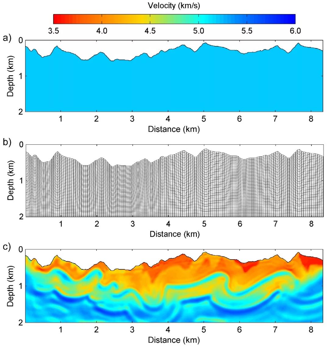 图1 (a) 任意常速度初始模型;(b) 用于起伏地表条件下谱元法正演的非规则四边形网格剖分示意图;(c) 利用所提最小二乘全走时反演方法结合全波形反演所得的高分辨率复杂浅地表速度结构