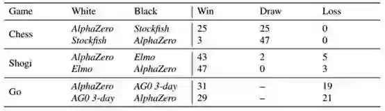 表1:国际象棋,将棋和围棋比赛中AlphaZero的评估,经过三天的训练,与Stockfish,Elmo和之前发布的AlphaGo Zero进行100场比赛,表中显示的是以AlphaZero视角的结果结果。