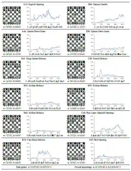 表2:分析12个最受欢迎的人类开局(在线数据库(1)中播放超过10万次)。每个开局都标有其ECO代码和通用名称。该图显示了AlphaZero每次开局自我对弈比赛和训练时间的比例。我们还从AlphaZero的角度报告了从每场比赛开局的100场比赛AlphaZero vs. Breakish比赛的胜负/平局/失败结果,无论是白色(W)还是黑色(B)。最后,从每个开局提供AlphaZero的主要变化(PV)