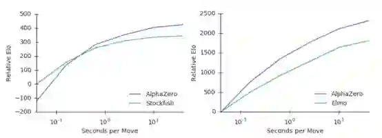 图2:用Elo评估AlphaZero每步的思考时间的可扩展性。(a)展示了在国际象棋中AlphaZero和Stockfish的表现,每一步的思考时间。(b)展示了在将棋中AlphaZero和Elmo的表现,每一步的思考时间。
