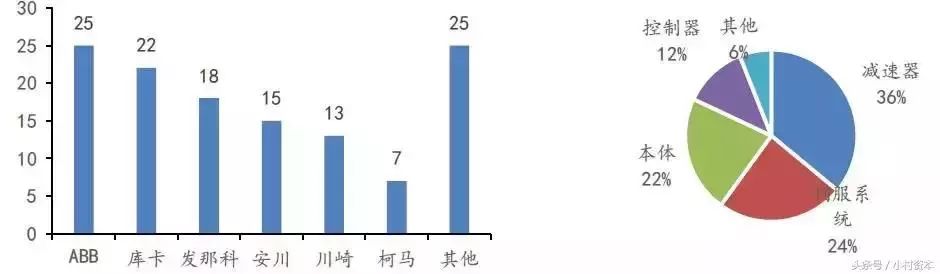 (左)中国系统集成商前100名本体合作企业分布 (右)中国多轴工业机器人成本构成