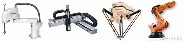 从左至右为:机器人、直角坐标机器人、并联机器人、多关节型机器人
