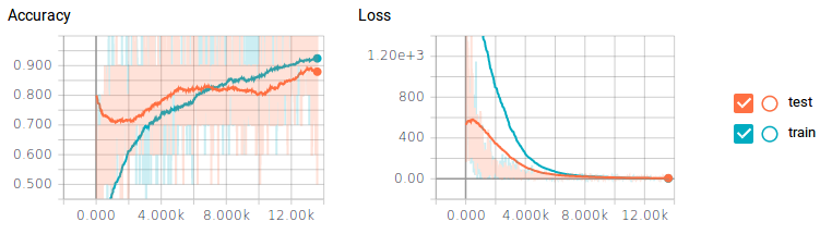 现在我们要使用TensorBoard,以便可以看到分类器工作的表现怎么样。我们将创建两个图:一个用于我们的训练集,一个用于我们的测试集。我们可以通过使用add_graph函数来可视化我们的计算图。我们将使用汇总标量来衡量我们的总体损失和准确性,并将我们的汇总合并到一起以便只需调用write_op来记录标量。