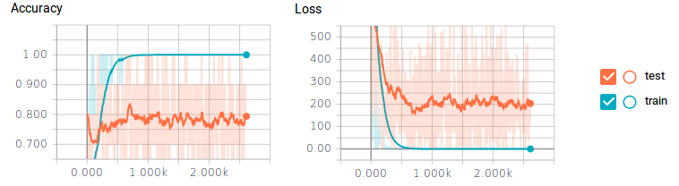 你可能会看到这里出了一个很大的问题。对于训练数据,分类器达到了100%的准确度和0%的误差损失,但是测试数据的准确度最多只能达到80%而且还有很大的损失。这就是一个明显的过拟合——一些典型的原因包括没有足够的训练数据或神经元数量太多。