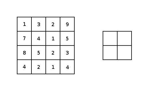 实质上,大多数卷积神经网络都包含卷积和池化。最常见的是,一个用于卷积的3×3内核滤波器。特别是,以2×2的步幅和2×2内核的较大值池化是基于内核中的较大像素值来缩小图像的一种激进方式。下图展示的是一个内核为2X2和两维上步幅都为2的简单例子。