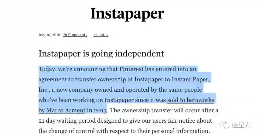 2018年夏天,Instapaper 从 Pinterest 剥离,由新成立的 Instant Paper LLC 运营,团队还是 P 站收购其之前的团队。