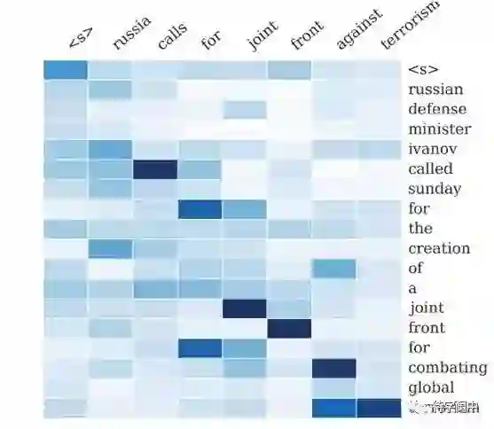 这个例子中,Encoder-Decoder框架的输入句子是:“russian defense minister ivanov called sunday for the creation of a joint front for combating global terrorism”。对应图中纵坐标的句子。系统生成的摘要句子是:“russia calls for joint front against terrorism”,对应图中横坐标的句子。可以看出模型已经把句子主体部分正确地抽出来了。矩阵中每一列代表生成的目标单词对应输入句子每个单词的AM分配概率,颜色越深代表分配到的概率越大。这个例子对于直观理解AM是很有帮助作用的。