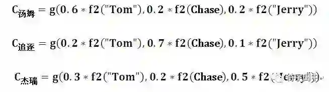 假设Ci中那个i就是上面的“汤姆”,那么Tx就是3,代表输入句子的长度,h1=f(“Tom”),h2=f(“Chase”),h3=f(“Jerry”),对应的注意力模型权值分别是0.6,0.2,0.2,所以g函数就是个加权求和函数。如果形象表示的话,翻译中文单词“汤姆”的时候,数学公式对应的中间语义表示Ci的形成过程类似下图:
