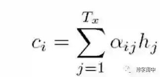 其中,f2函数代表Encoder对输入英文单词的某种变换函数,比如如果Encoder是用的RNN模型的话,这个f2函数的结果往往是某个时刻输入xi后隐层节点的状态值;g代表Encoder根据单词的中间表示合成整个句子中间语义表示的变换函数,一般的做法中,g函数就是对构成元素加权求和,也就是常常在论文里看到的下列公式: