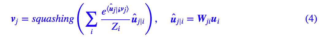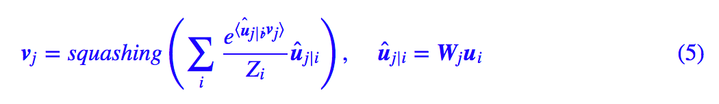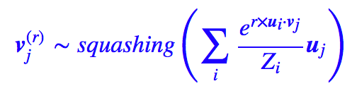 从上往下看,那么 Capsule 就是每个底层特征分别做分类,然后将分类结果整合。这时 vj 应该尽量与所有 ui 都比较靠近,靠近的度量是内积。
