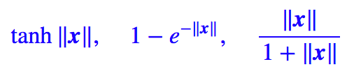 其中 x/‖x‖ 是很好理解的,就是将模长变为 1,那么前半部分怎么理解呢?为什么这样选择?事实上,将模长压缩到 0-1 的方案有很多,比如: