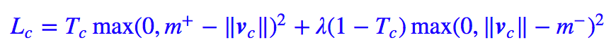 事实上,Capsule 做的事情就是检测有没有这个类,也就是说,它把一个多分类问题转化为多个 2 分类问题。因此它并没有用普通的交叉熵损失,而是用了: