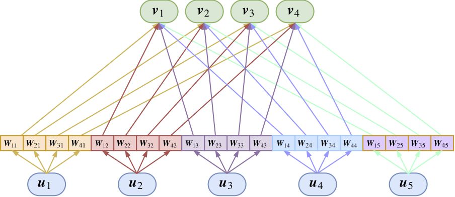 图上只展示了 u1 的连接。这也就是说,目前已经有了 u1 这个特征(假设是羽毛),那么我想知道它属于上层特征 v1,v2,v3,v4(假设分别代表了鸡、鸭、鱼、狗)中的哪一个。