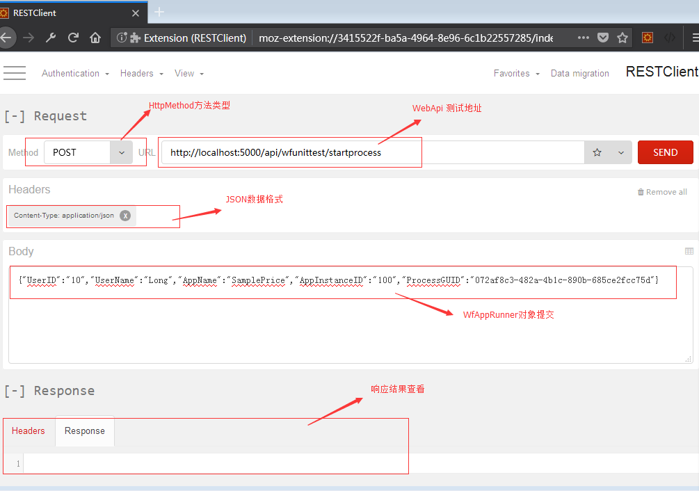 引擎接口测试采用RestClient工具,比较方便快捷。通常采用统一的接口方法,将不同类型的流程JSON数据格式作为测试用例来提交测试。