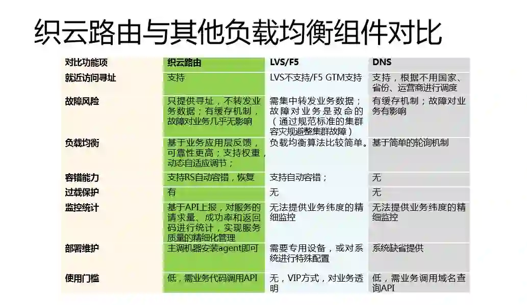 三是容错能力,F5 和 LVS 的容错只能探测到端口的连通性,而织云路由可以自定义容错场景。