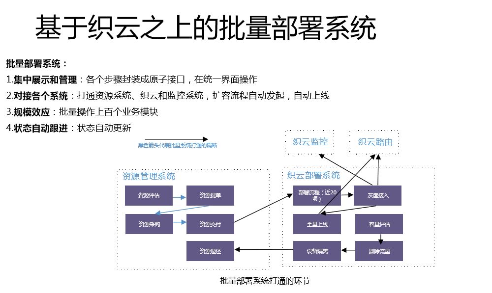 对接各个系统,比如说哪个模块扩容多少,在资源申请单的时候这是录入了的。批量系统根据资源申请单自动生产设备,把设备分配给相应的模块,批量在织云上发起扩容流程。