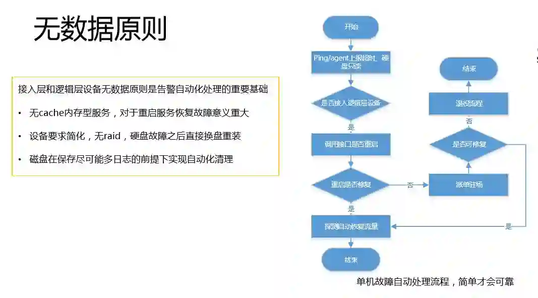 这个原则是很重要的,对于我们接入和逻辑层,一个人维护 2 万台设备是非常关键的基础。我们要求所有的接入层和逻辑层设备无数据。