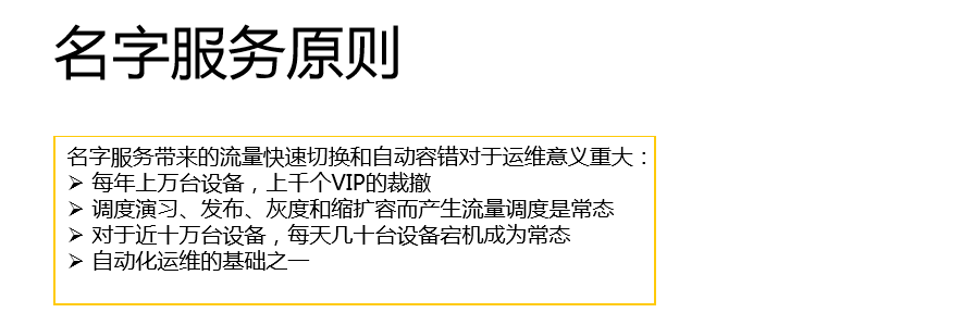 近 10 万台设备,每天几台设备宕机成为一个常态,名字服务和容错是自动化运维的基础之一,重要性我前面也讲了很多。那么这里我分享一下运维是如何去影响研发侧,把名字服务的原则落实的。