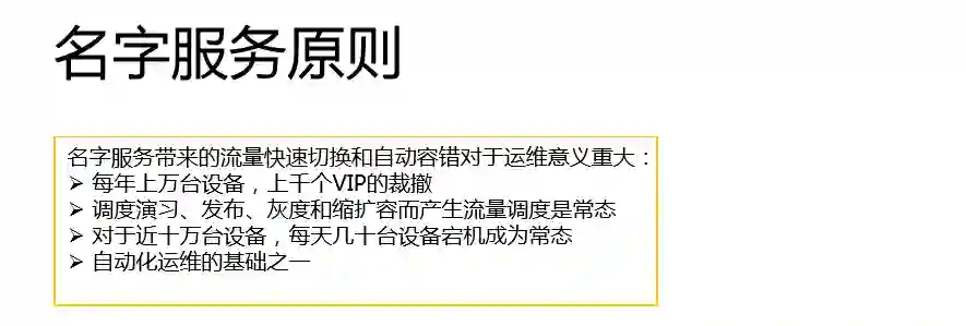前面说了,名字服务非常关键,我们要保证系统任何一个寻址都有名字服务。我们每年有上万台设备裁撤,没有 IP 是不能动的,所有 IP 都是可以变的。