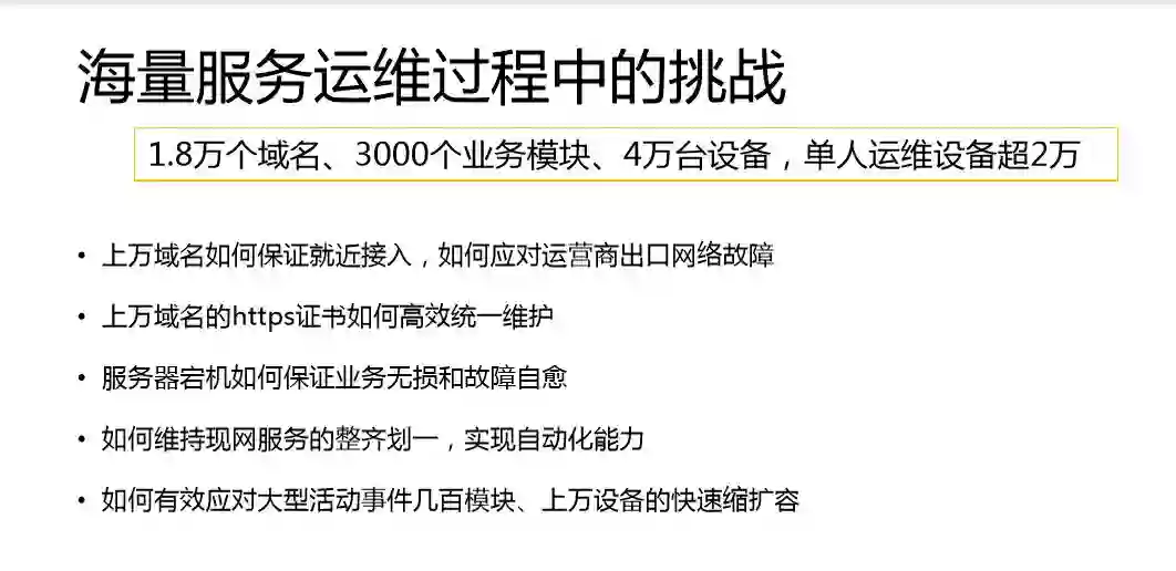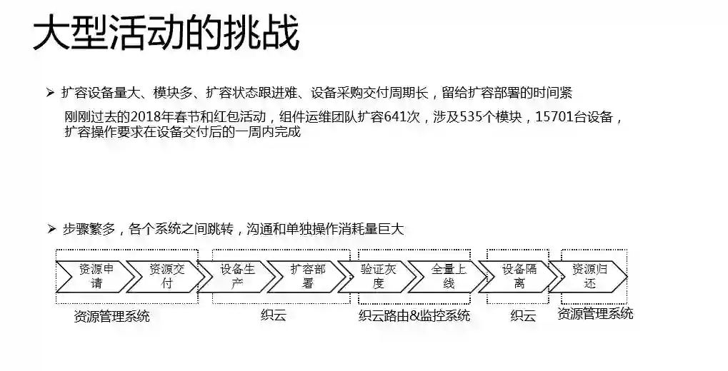 这样大家 happy 的节假日就变成我们运维的苦难日,因为涉及到大量设备上线、模块扩容,这是我们面对的第五个挑战,如何应对大规模的缩扩容。