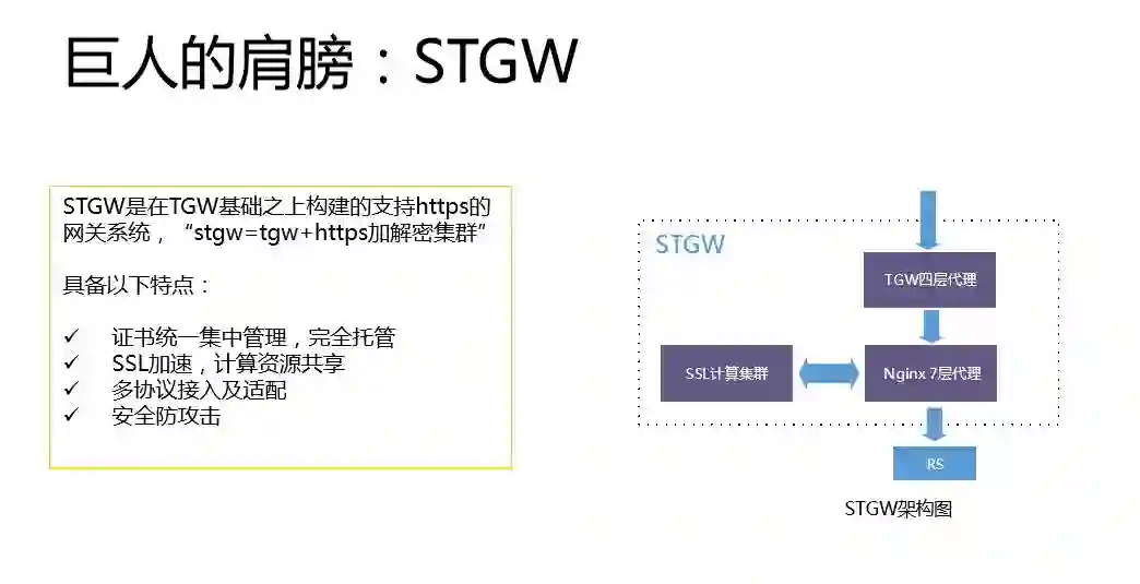 关于 STGW,你可以认为跟 TGW 是差不多的,它只是在 TGW 基础上支持了 https,自从苹果启用 ATS 安全规范之后,新上线域名默认就会支持 https 接入,因为你说你的网站不支持 https 就不好跟人家打招呼。