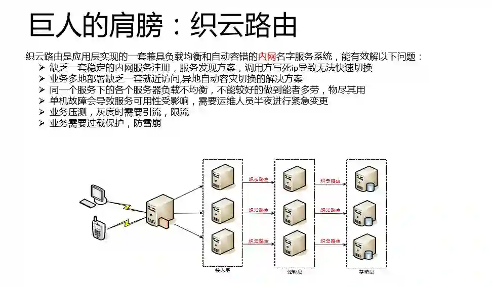 这个 TGW 与业界开源的 LVS 和商用的 F5 是类似的东西。请求经过网关的负载均衡,到 Web 层服务器,然后到逻辑层、存储层,图中间的织云路由是内网的负载均衡系统。