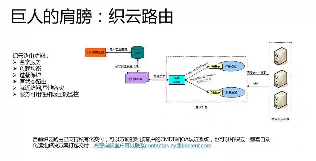 相对 F5 和 LVS 这种无侵入的方式,基于调用方上报织云路由实现了后台服务质量的精细化管理,织云路由的成功率是 SNG 后台服务质量的考核标准,通过这个推动后台服务的质量。