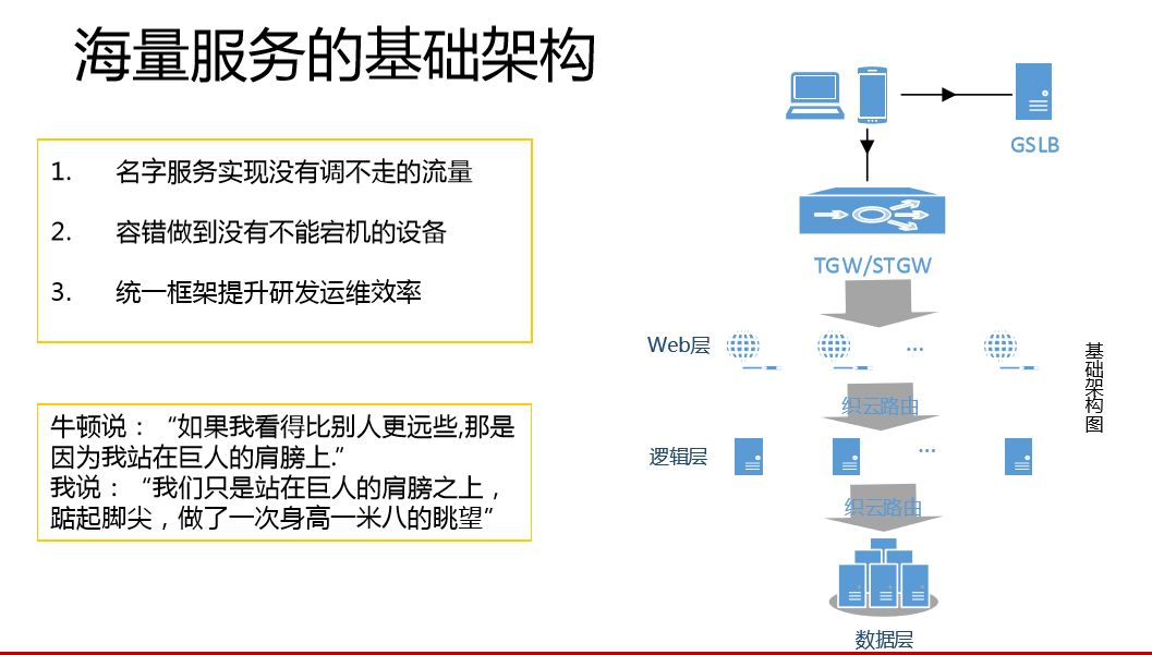 我将从海量服务的基础架构、在运维过程中坚持的一些原则和支撑大型活动事件的技巧三个方面来分别阐述我们如何应对上述的挑战。
