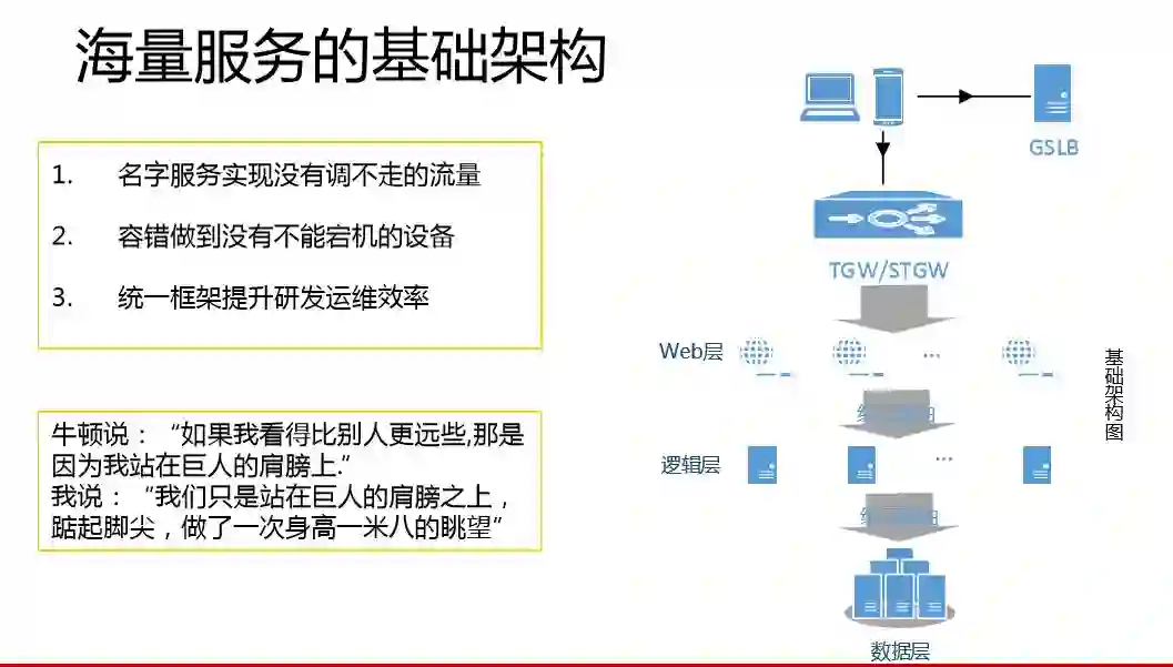 牛顿说,如果我看得比别人更远,是因为站在巨人的肩膀上。如果我们能够运维万台服务器,是因为我们站在巨人的肩膀上,踮起脚尖,做了一次一米八的眺望。