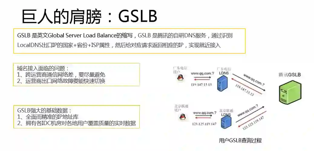 GSLB 是腾讯自研的 DNS 服务,通过识别 Local DNS 出口 IP 国家+省份+ISP 属性,然后给对应请求返回相应的 IP,实现就近接入。