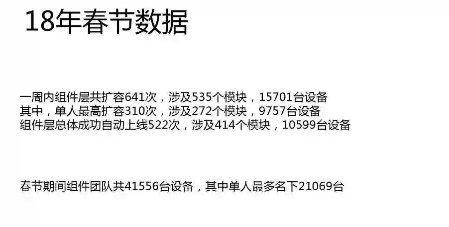 我们最终做到的效果就是能够在一周内把 15701 台设备 600 多次扩容全部搞定。春节期间的组件团队单人最多的时候运维超过 2 万台设备。