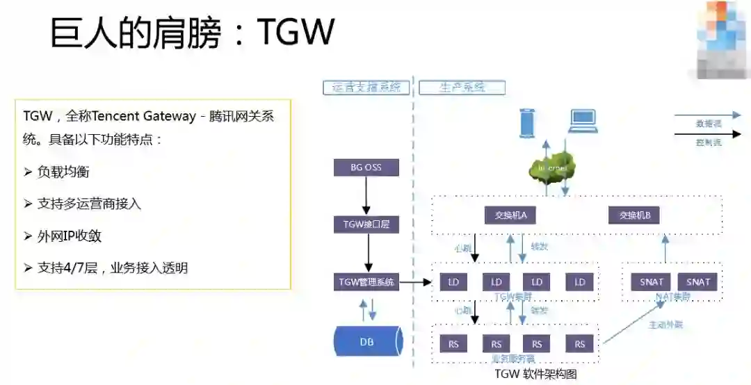 这种背景下,TEG 的基础架构部推出了 TGW 这个系统。它的最大特点是能够收敛外网 IP,只需要一个外网 IP,所有数据包的进出都是通过 TGW,对后端真实的服务器是没有外网需求的。