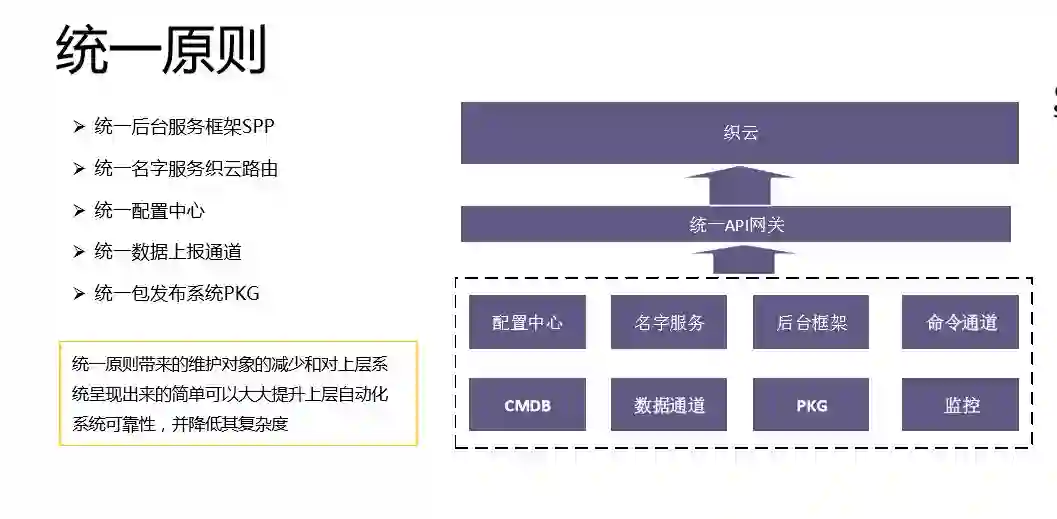 这些是自动化平台的基础,因为统一带来维护对象的减少和对上层调用系统呈现出来的简单,可以大大提升上层自动化系统的可靠性。