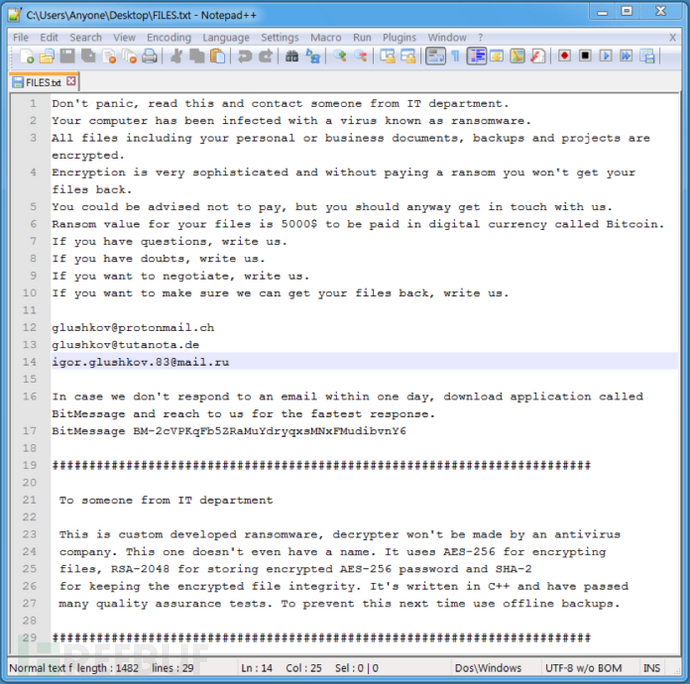 该勒索软件会在系统的许多文件夹中创建FILES.TXT文件(图3)。 HELP.txt与FILES.txt文件的内容是相同的,该文件同时还会在执行勒索软件的桌面文件夹中。