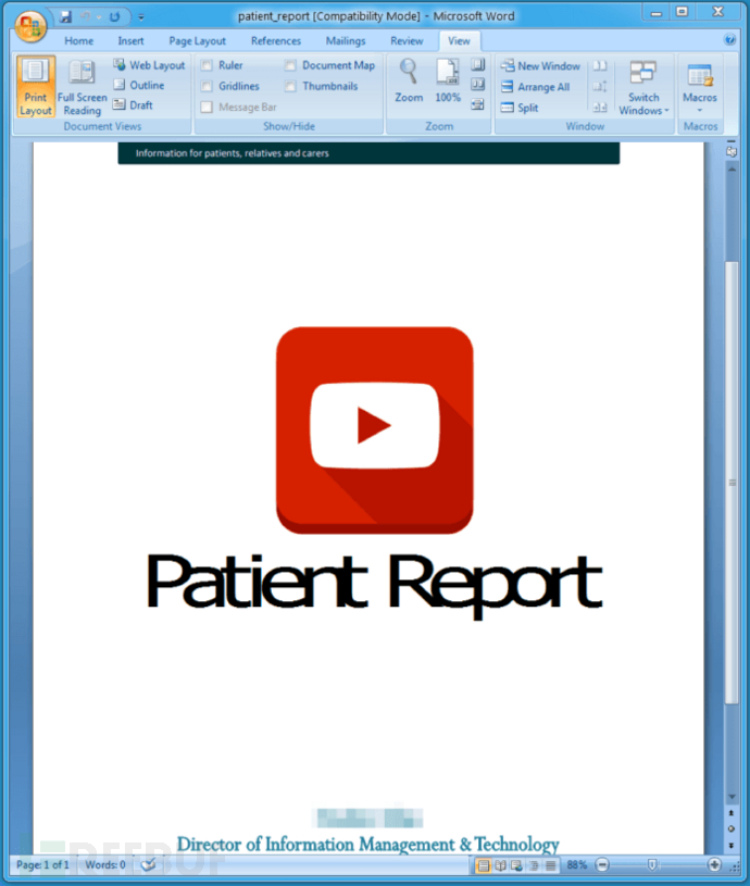 恶意Word文档看起来像是份专利医学报告,并标有英国医院的信息管理与技术部门的标志。