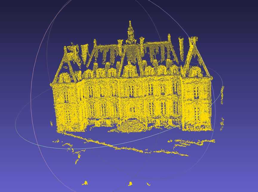 PMVS/models文件夹中生成一个大小为15.2MB的pmvs_options.txt.ply点云文件,用meshlab打开即可看到重建出来的彩色稠密点云,如所示。
