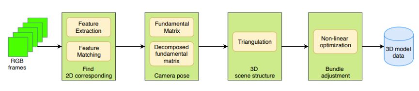 Structure from Motion(SfM)是一个估计相机参数及三维点位置的问题。一个基本的SfM pipeline可以描述为:对每张2维图片检测特征点(feature point),对每对图片中的特征点进行匹配,只保留满足几何约束的匹配,最后执行一个迭代式的、鲁棒的SfM方法来恢复摄像机的内参(intrinsic parameter)和外参(extrinsic parameter)。并由三角化得到三维点坐标,然后使用Bundle Adjustment进行优化。