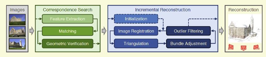 增量式SfM从无序图像集合计算三维重建的常用方法。在[1]的基础上,增量式SfM可分为如图 3所示几个阶段:图像特征提取、特征匹配、几何约束、重建初始化、图像注册、三角化、outlier过滤、Bundle adjustment等步骤。