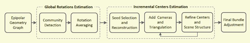 用全局的方式提出一种基于社区的旋转误差平均法,该方法既考虑了对极几何的精度又考虑了成对几何的精度。基于已经估计的相机的绝对旋转姿态,用一种增量的方式估计相机光心位置。对每个添加的相机,其旋转和内参保持不变,同时使用改进的BA细化光心和场景结构。