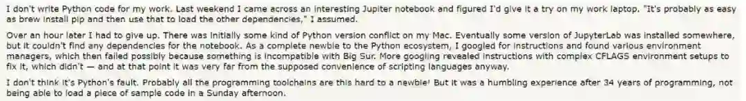 Reddit/HN 上的有些人更粗鲁:你甚至不会安装 Python 或某个版本,你一定是个傻瓜。有一个人告诉我,非常非常严肃:你只要学会使用 virtualenv,你所有的问题就都不存在了。好吧,谢谢,好像我没那样想过是的。