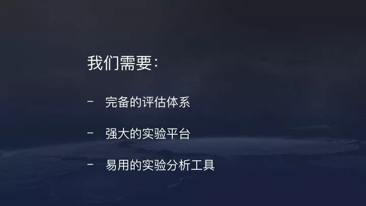 全面的评估推荐系统,需要完备的评估体系、强大的实验平台以及易用的经验分析工具。所谓完备的体系就是并非单一指标衡量,不能只看点击率或者停留时长等,需要综合评估。过去几年我们一直在尝试,能不能综合尽可能多的指标合成唯一的评估指标,但仍在探索中。目前,我们上线还是要由各业务比较资深的同学组成评审委员会深入讨论后决定。