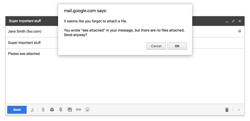 ▲ Gmail 会查找包含类似“attachment”和“attached”之类词语的短语,以便在您忘记插入附件时弹出提醒。启发式设计在这里就很有效。尽管机器学习系统很可能能够捕获更多的潜在失误,但其构建成本却要高得多。