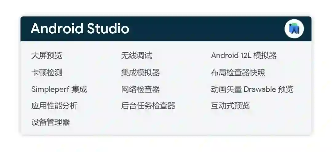 Android Studio 是用于构建原生界面的 Android 全新工具包,目前 Android Studio Arctic Fox 稳定版已正式更新,可实现包含 Wear OS by Google 设备在内的多设备类型覆盖。