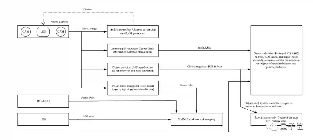 以石头T7 Pro扫地机器人的算法为例,双目视觉模块分为视觉控制和深度估计两部分,一个智能补光,一个估计深度。(甚至专门做个红外拍出的相片,搞成数据集,训练补光识别效果)