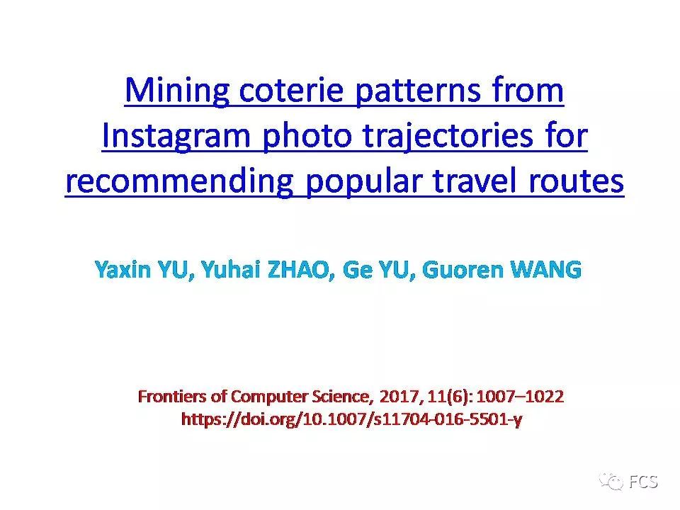 然而,目前鲜有研究工作可从不同游客的Instagram图片中提取出兴趣类似的一小组人的旅行轨迹。为此,本文提出了一个创新的概念:兴趣圈(coterie),揭示在相同位置和路径,游客拍摄的Instagram图片中隐藏的具有代表性的旅行轨迹模式。文章描述了三方面工作发现,包括兴趣圈(coterie)、封闭兴趣圈,和基于封闭兴趣圈的出游路线推荐系统。
