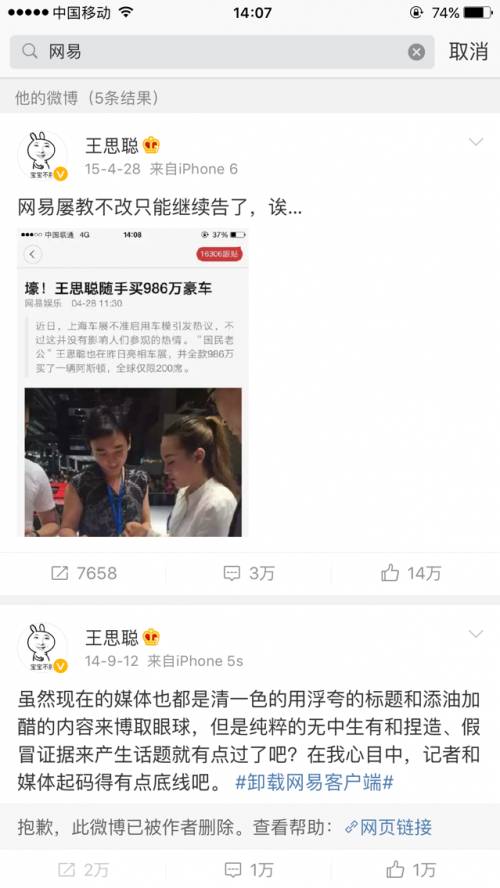 因为此事,2014年9月12日王思聪还在其微博发文称:“虽然现在的媒体也都是清一色的用浮夸的标题和添油加醋的内容来博取眼球,但是纯粹的无中 生有和捏造、假冒证据来产生话题就有点过了吧?在我心目中,记者和媒体起码得有点底线吧。”还顺带的发起了卸载网易客户端的话题。