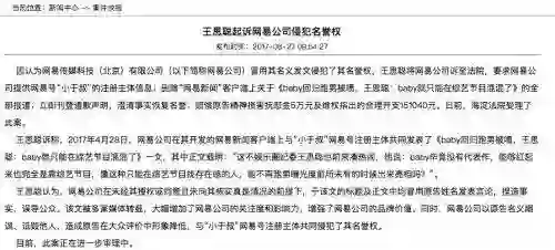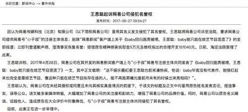 王思聪诉称,2017年4月28日,网易公司在其开发的网易新闻客户端上与“小于叔”网易号注册主体共同发表了《baby回归跑男被喷,王思 聪:baby就只能在综艺节目混混了》一文,其中正文载明:“这不娱乐圈纪委王思聪也前来凑热闹,他说:baby毕竟没有代表作,能够红起来也完全是靠综 艺节目,像这种只能在综艺节目找存在感的人,能不再跑男曝光度前所未有的时候出来亮相吗?”。